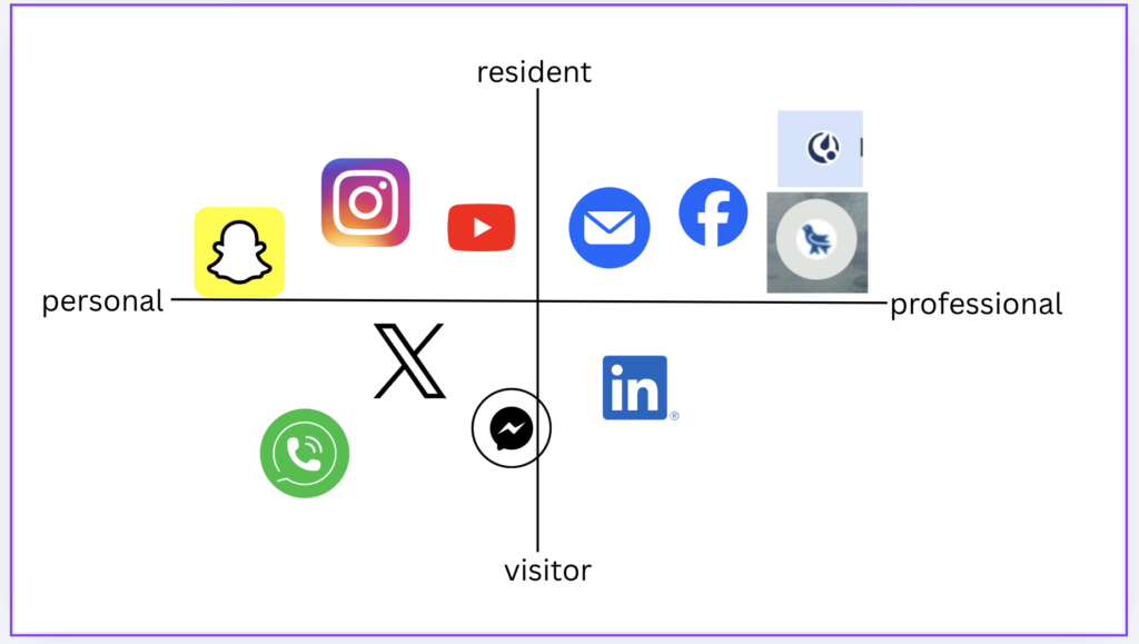 In this week’s activity, the V&R model explains that people do not just “use” the internet in one way. Instead, we move between being visitors, who use online tools to complete tasks, and residents, who interact and build an online presence (White & Le Cornu, 2011). Creating my own map helped me better understand the difference between my personal and professional digital identity.